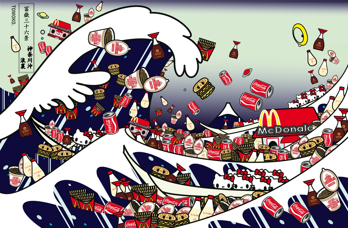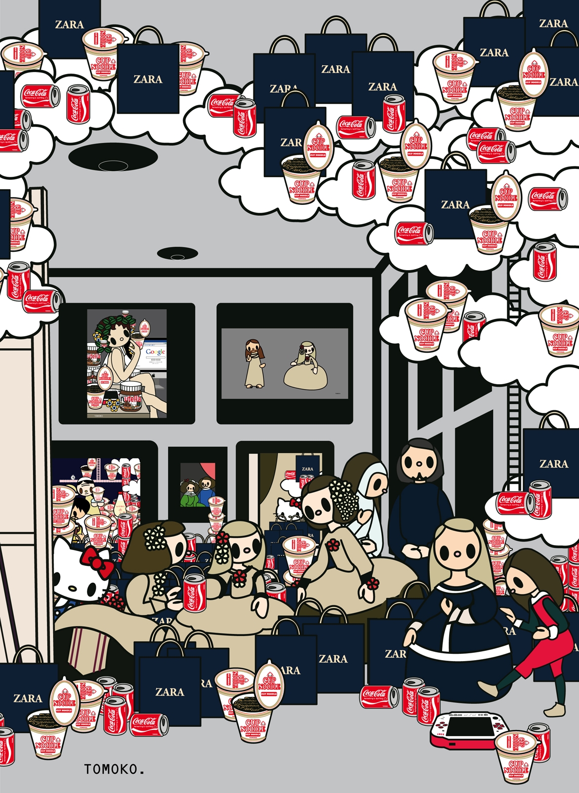 En el entorno privilegiado de la urbe italiana, Tomoko ha desarrollado un lenguaje que, en clave superflat, se apropia de los grandes maestros del arte clásico –renacentista y barroco en su mayoría- para utilizarlos, de un modo que recuerda al Equipo Crónica, como símbolos de la civilización occidental que ha invadido su Japón natal. ¿Qué mejor metáfora visual de esta “invasión” que la Ola de Hokusai repleta de emblemas consumistas? La obsesión por los efectos del capitalismo extremo se traduce en un horror vacui de bolsas de Zara, consolas PSP, productos Apple, comida precocinada, YouTube y Hello Kitty (el Mickey Mouse nipón). Más allá de la reinterpretación en estilo anime, es la famosa gata la que presta su fisionomía –esos grandes y vacíos ojos- a personajes como la Venus de Botticelli o el Narciso de Caravaggio.