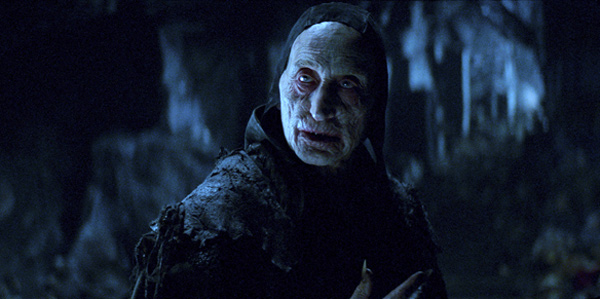 Entre escenarios inclasificables entre una parte más gótica y otra más románica (la tipificación también viene en el mismo lote con la parte artística de la película), derrumbados, pétreos y con paisajes desolados ante tanta violencia animal y humana, el padre del protagonista aparece angosto en una pequeña cueva en mitad de la colina de la Muela Rota (no os riáis porque el nombre está perfectamente elegido; a mí la segunda cosa que más miedo me da en la vida después de un Drácula es tener una muela rota).