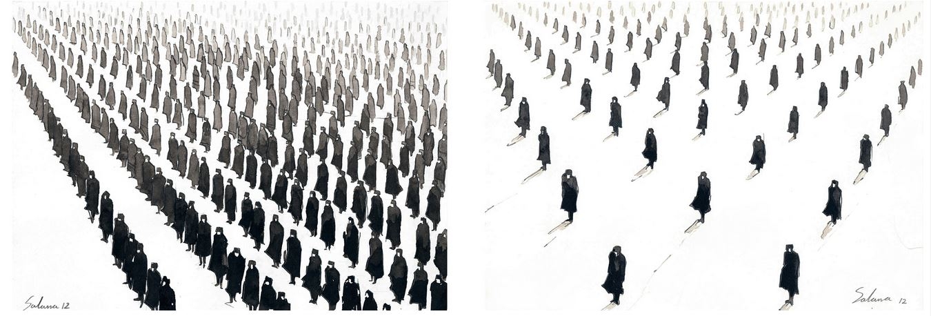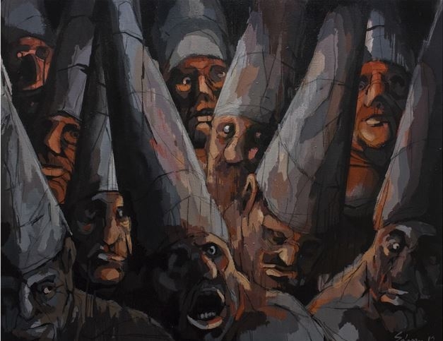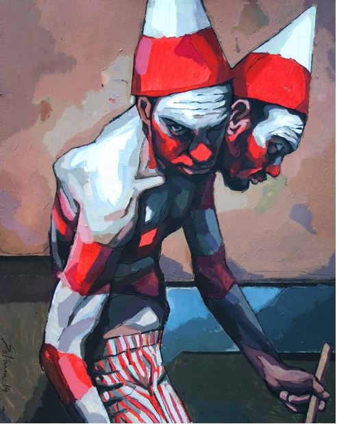 Figuras perversas, de cuerpos deformes e inquietantes nos desafían con una mirada amenazadora directa. Algunos, como este Hombre bicéfalo 1, portan un capirote. Un elemento cuya ascendencia vertical, es potenciada por la agresividad visual cromática, que nos remite a los asuntos oscuros y mórbidos de los Caprichos de Goya. Una apelación al pasado más lúgubre y espeluznante del ser humano también evocada con sus formaciones de autómatas desalmados que, por su frialdad y perversión, nos recuerdan a los robóticos ejecutores de la Alemania nazi.
