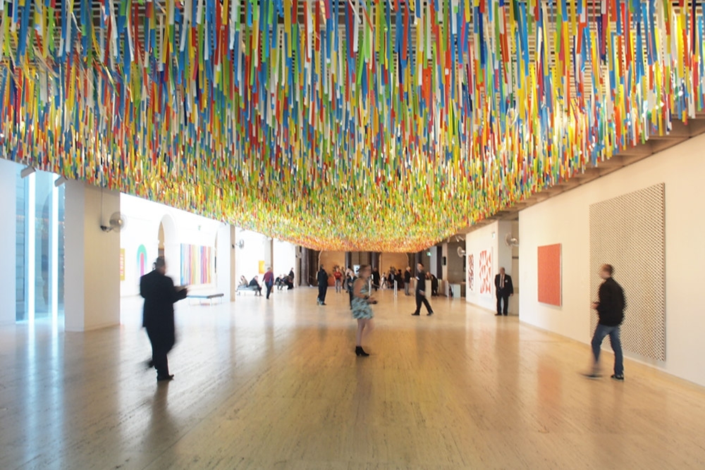 Su última instalación, ‘Rally’, (desde el 18 de marzo al pasado 21 de septiembre en la Art Gallery of New South Wales de Sidney, Australia) se inspira en las pinceladas rápidas de color de los pintores impresionistas, recurriendo a la vez al contraste entre, por un lado, lo exuberante y por otro del bajo coste al tratarse ‘tan sólo’ de 60.000 tiras de colores de plástico colgados del techo de la sala central de la galería. Es, hasta el momento, su mayor instalación. Para obras más pequeñas, como las mostradas en ‘Liberty and Anarchy‘ en la Leeds Art Gallery de Gran Bretaña (7 de diciembre de 2012 al 24 febrero de 2013), utiliza otro tipo de materiales de las labores cotidianas como la lana.