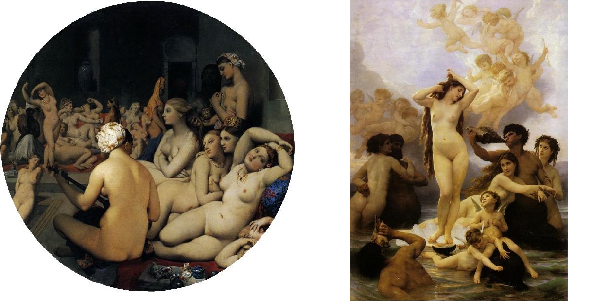 1. Dominique Ingres, El baño turco, 1862. Museo del Louvre, París. 2. William-Adolphe Bouguereau, El nacimiento de Venus, 1879. Museo de Orsay, París.