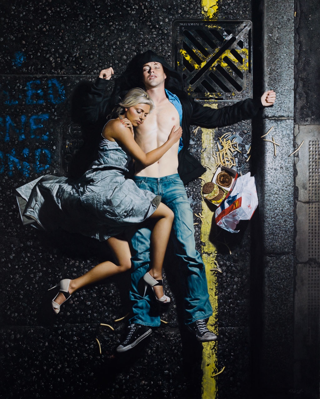 Como si de un Cristo se tratara, un joven cargado de bolsas emerge entre las sombras para buscar la redención de una sociedad presa del consumo, la vanidad, destructora del medioambiente y de su propia especie. Y es así, con un mensaje tan contundente, como el artista Mitch Griffiths nos hace reflexionar sobre nuestra realidad y nuestra evolución.