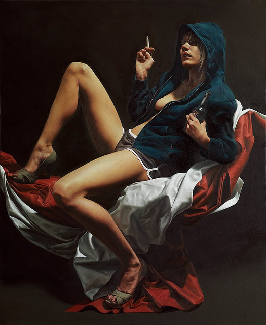 Lo que atrapa de la obra de este artista británico no es su técnica pulida y precisa, sino el contraste existente entre la temática claramente crítica y el lenguaje inspirado en los pintores clásicos.