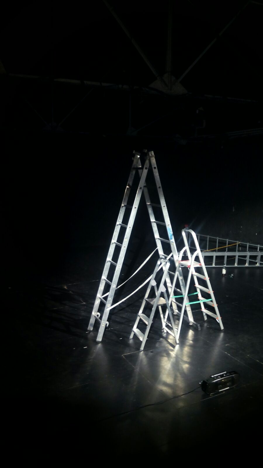Hay oscuridad en el escenario de Nave 73. Hay cuatro escaleras, varias linternas y tres actores en escena. Hay un espacio recóndito, misterioso y unas voces extrañas surgen desde un radiocasete con mensajes de radio mezclados y extrapolados de lo que alguna vez fue una sociedad, que nos da una pista del aspecto que tiene el mundo de los personajes; destruido, tenebroso y olvidado, como si el fin del mundo estuviera cerca o como si no hubiera un mañana.