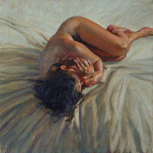En el marco de una estancia vacía encontramos figuras pensativas, estáticas, desnudos inmóviles sobre las sábanas… Sujetos aislados, solos consigo mismos. Retratos anónimos de la frágil y solitaria vida contemporánea que nos recuerdan a la obra de Edward Hopper. Una pintura realista , sugerente, que ambiciona un trasfondo psicológico.