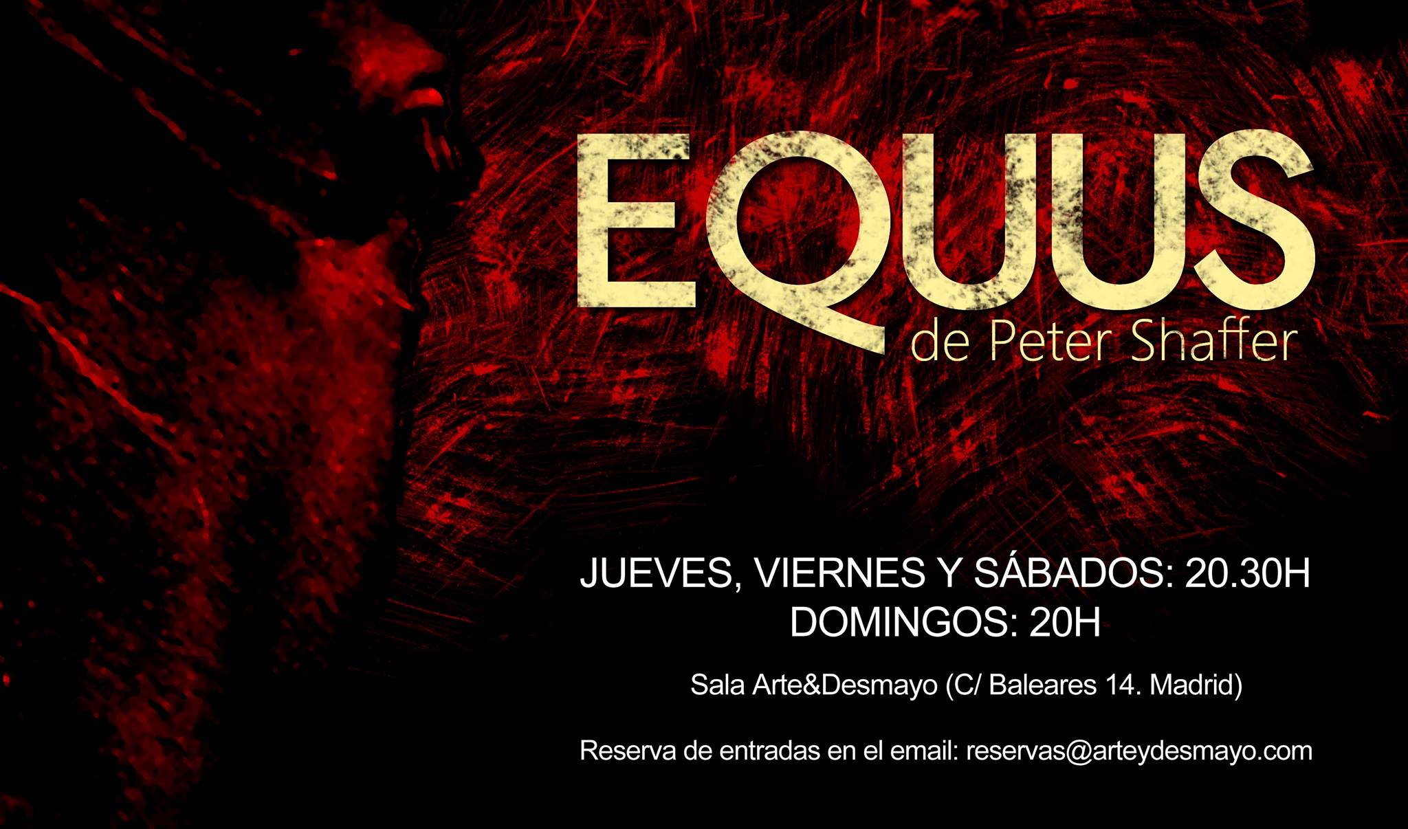 El pasado viernes 15 de enero la Sala Arte&Desmayo acogió la obra Equus, escrita por Peter Shaffer en 1973. Desde su estreno ese mismo año en Londres, no ha parado de cosechar éxito a nivel mundial y por fin ha llegado a Madrid, después de 40 años desde su última representación, para poder disfrutar de una historia de “fascinación sexual y religiosa”.