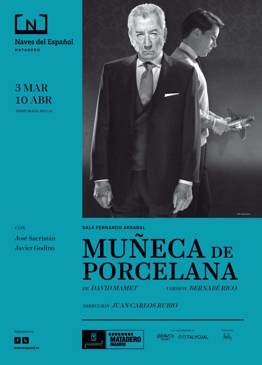 Desde el pasado 3 de marzo y hasta el próximo 10 de abril, la Sala Fernando Arrabal del Matadero de Madrid acoge Muñeca de porcelana, de David Mamet, una obra de teatro defendida por José Sacristán y Javier Godino en escena, bajo la dirección de Juan Carlos Rubio, dentro de una escenografía llena de secretos poderosos a los que el público se asoma desde las decisiones que van tomando los personajes para salvarse.