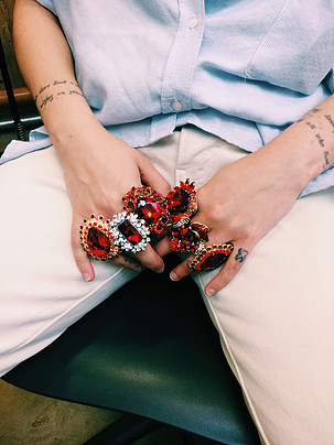 Un anillo con forma de compresa, pulseras con tampones o el color rojo situado en la posición perfecta para remarcar la situación mensual son algunos de los identificativos de esta llamativa colección que la artista declara estar inspirada “en la menstruación y en el frustrante, y con fugas, cuerpo femenino. Mi colección recoge tampones, compresas, jabones… y todos los productos que se les dan a las mujeres para controlar sus periodos”.