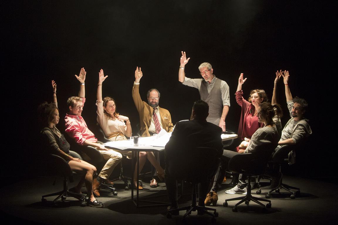 En esta obra de teatro hay nueve actores en escena que se pasean por su sala de deliberación llenos de prejuicios, miedos, quejas y quizás algo de esperanza que les hace seguir adelante y cambiar de opinión con su decisión de culpable o no culpable. Ninguno de ellos aparece individualizado y todos forman un reparto impecable que se organiza la acción en una perfecta armonía constante. El número 1, interpretado por Velasco, “ejerce como árbitro. Es un hombre con una rectitud que le hace asumir la legislación y las leyes tal cual son”, explicaba el actor. Víctor Clavijo añadía que, gracias a este reparto tan coral, “he reaprendido la capacidad de escucha como actor. Es importante entender que el foco no está en uno, está en la historia y que somos vehículos para contar una historia. Es una enseñanza que me llevo de este montaje; dejar el ego y estar preparado para saber cuándo tienes que ayudar a un compañero, a escucharle en silencio y para que tu frase sea una reacción a la escucha del otro”.