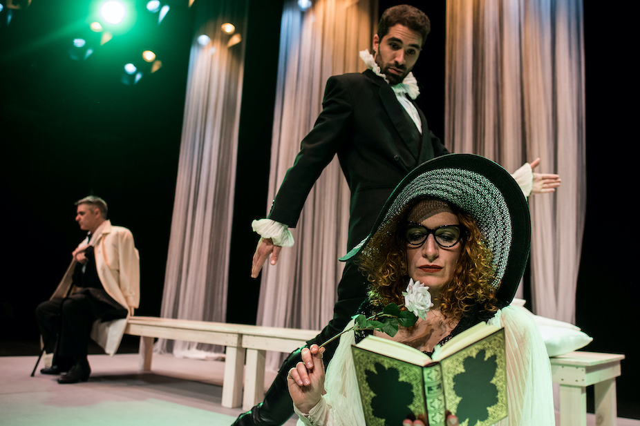 En cuanto a la escenografía, creada por Elisa Sanz, tengo que destacar su sencillez y a la vez su eficacia y buen gusto. En muchas ocasiones, menos es más y este es un ejemplo de ello. Los bancos corridos en tonalidades blancas, los cortinajes en el mismo tono y, sobre todo, los libros en primera plana nos hablan de la autora y de la esencia del mensaje de la obra. A la vez que nos sitúan en todos los escenarios sin la necesidad de artificios y fuegos artificiales.