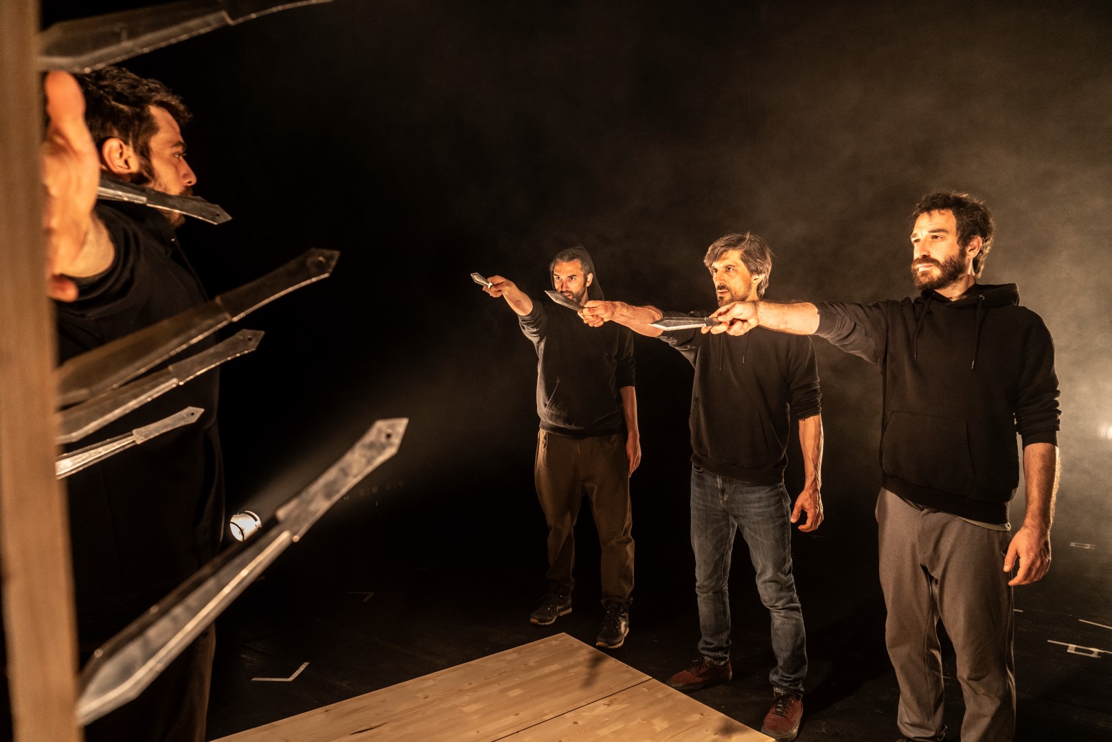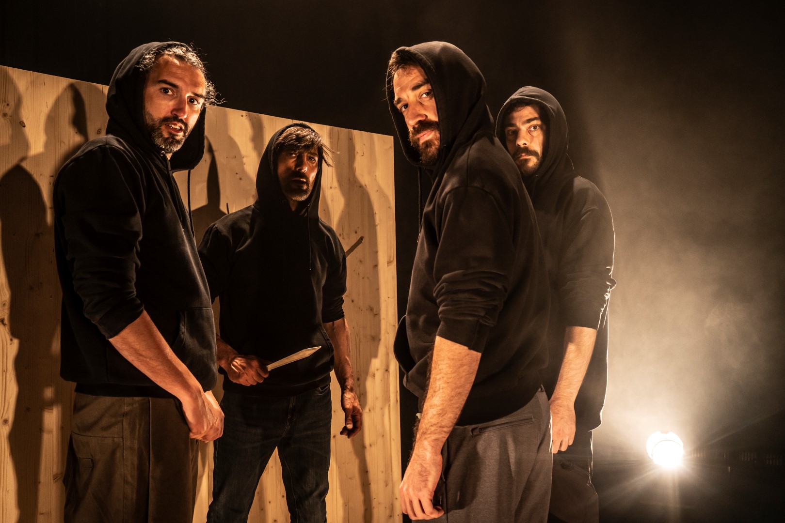 Miguel Frutos, Carlos Marcos, Josu Montón, Fernando Santaolalla / Isaac Posac y Jorge Silvestre / Nico Nale elaboran un recorrido escénico en el que todos son iguales pero diferentes. Cada uno alza la voz para juntarse, examinarse y cuestionarse, también como grupo. Sus ejercicios lanzando cuchillos contra su propia sombra y redibujándose sobre su propio cuerpo perfilan nuevos espacios físicos y sensitivos. Desde aquí, van dejando al descubierto sus intimidades a la vez que parándose a preguntar y a escuchar. Todos ellos empujan en una misma dirección varios relatos autobiográficos con señales marcadas de fondo con un agudo metrónomo, con el que poner la tilde sobre diferentes urgencias personales y colectivas.