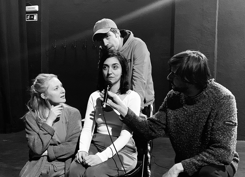 Pepe Alacid, en música y espacio sonoro, ¡qué bien encontrarte en este montaje y que tu trabajo resuene en él! Con sus elecciones nos enamoramos, pensamos y cantamos que todo irá bien, nos puede la desesperanza y nos vuelve la ilusión en la siguiente escena. El cartel, joya de Carlos Brayda (ilustración) y Álex Velasco (diseño gráfico), es otro punto y seguido que incluir en la unidad de esta propuesta. Sus trazos y su buen hacer aciertan en señalarnos, antes de empezar, ese punto de búsqueda que estamos a punto de compartir gracias a los folletos repartidos por la sala.