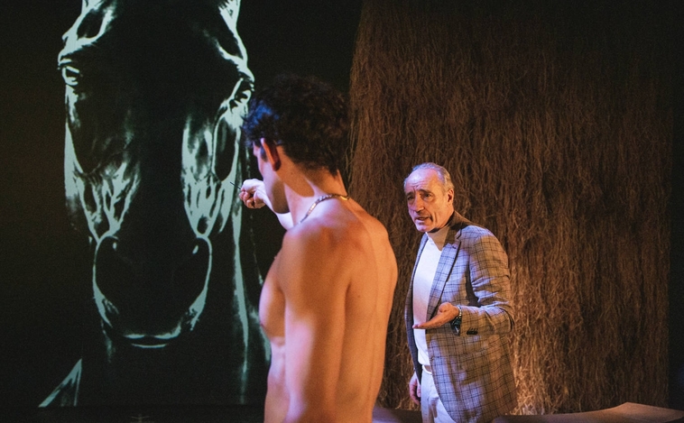 En forma de thriller psicológico, se recrea el recorrido circunstancial de un joven que queda retratado por la enseñanza recibida (madre devota y religiosa y padre estricto), aquello que le ha faltado (contacto con otros jóvenes de su edad) y su fascinación por los caballos, una atracción que contiene la mayor de las pistas. En paralelo, el público también va conociendo la vida de su psiquiatra, en un mundo correcto, lleno de reglas y acorazado en la razón pura, y en quien también encontramos tanto o más sufrimiento. Precisamente, es este doctor el que sirve de contrapunto para encender la duda y queda encarnado en un actor que nos deleita con uno de los momentos finales más bellos y atroces que se pueda respirar en un teatro. Me parece que Roberto Álvarez es de esas figuras que han llevado toda su vida actoral un buen y ejemplar galope, pero que aquí despunta como nunca, produciendo gran satisfacción y goce.